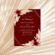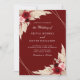 Ce faire-part de mariage rustique allie éléments naturels et élégance, avec un beau bouquet de roses bordeaux et une pelouse de pampas. L'atmosphère rustique est maintenue par le style décoratif, tandis que la police élégante garde le ton élevé. Le texte entièrement personnalisable est clair et concis, fournissant tous les détails importants, y compris la date, l'heure et l'emplacement du mariage. Cette invitation est parfaite pour les couples qui souhaitent ajouter une touche de charme rustique tout en conservant un ton sophistiqué pour leur journée spéciale. Trouvez les articles correspondants dans Roses de Bourgogne et Collection de Mariages de Pampas Grass. Un fichier imprimable est disponible.