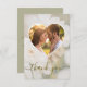 Exprimez votre gratitude avec élégance en utilisant cette carte de remerciement romantique qui présente une photo de rose blanche rêveuse de Destei, estompée avec un voile blanc pour un look intemporel. Le devant comprend un cadre photo en forme de cœur où vous pouvez ajouter une photo de couple personnalisée, ainsi que « merci » en écriture élégante. Le verso présente une couleur de fond vert sauge mat avec une silhouette de cœur subtile, un espace pour votre message de remerciement et une signature personnalisée avec les noms. Une façon sincère et élégante de remercier vos invités.