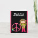 Finissez votre célébration avec ce carte de remerciements hippie de l'anniversaire des filles adorables. il a un grand signe de paix de roses indien avec les fleurs colorées du côté de lui. À côté de lui est une fille mignonne avec de longs cheveux bruns. Elle a une chemise colorée de colorant de cravate avec le bandeau assorti. Il y a une frontière de roses indien avec le pois blanc autour d'un centre noir. Vérifiez les nombreux autres conceptions et produits dans cette ligne. illustrations de ©JW