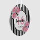 Classic mince bandes verticales noir et blanc comme arrière - plan. Avec des roses roses roses romantiques, féminines et roses. Un cadre blanc et noir sur le devant avec modèle pour l'âge, le nom et la date. Âge numéro 16 en rose, nom et date en noir. Le nom est écrit avec un script de style écrit à la main. Parfait comme cadeau de 16e anniversaire Sweet, décoration de fête ou tenue de jour.