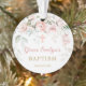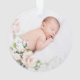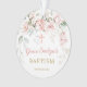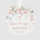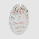 Roses Roses Roses Roses Verdure Feuillage Fille Baptême ornement. Cette conception présente une illustration de roses rose pâle et de tiges vertes feuillues en aquarelle. Sur le dessus de l'affiche se trouve une image de croix. Personnalisez avec vos propres mots - vous pouvez utiliser ces balises pour les baptêmes, les saintes communions ou les confirmations. A l'envers, il y a une photo de bébé.