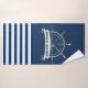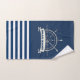 Cette image présente une roue de bateau, une ancre sur un arrière - plan rayé bleu marine.