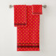 Serviette rouge vif sertie de petits pois jaunes. Couleur arrière - plan rouge avec un motif de pois jaunes. En haut et en bas, il y a des bandes horizontales rouge foncé.