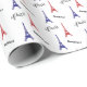 Enveloppez vos cadeaux de France dans ce joli papier d'emballage blanc avec des tours Eiffel rouges et bleues et les mots Paris et Bonjour !