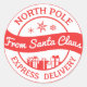 Un autocollant de style postal de Noël pour les cadeaux. Le dessin dit que l'express du pôle Nord est livré autour de la frontière en rouge et blanc et il dit "Du Père Noël" en face, avec des flocons de neige et une pile de cadeaux dans l'arrière - plan. L'autocollant est conçu pour ressembler à une marque postale ou à un sceau du pôle Nord. Ce serait parfait pour décorer des cadeaux de Noël ou pour sceller les enveloppes sur vos cartes de Noël.