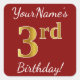 Ce simple autocollant d’anniversaire comporte un message comme "3e anniversaire de YourName!", avec le "3e" ayant une apparence de couleur fausse/imitation or, sur un arrière - plan de couleur rouge. Le nom peut être customisé. Des autocollants comme ceux-ci pourraient peut-être être un cadeau pour quelqu'un qui célèbre son troisième anniversaire, ou ils pourraient peut-être être utilisés comme décorations lors d'une fête d'anniversaire. [~Z0000245]