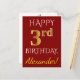 Ce design simple et personnalisé de carte postale d'anniversaire comporte le message "HAPPY 3rd BIRTHDAY", avec le "3rd" ayant une apparence fausse or. L'avant est également orné d'un nom personnalisé et d'un arrière - plan rouge. Le dos contient un message de voeux d'anniversaire personnalisable, ainsi que l'adresse personnalisable du destinataire de la carte postale d'anniversaire. Il pourrait être envoyé à quelqu'un qui célèbre son troisième anniversaire. [~Z0000071]
