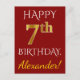 Ce design simple et personnalisé de carte postale d'anniversaire comporte le message "HAPPY 7th BIRTHDAY", avec le "7th" ayant une apparence fausse or. L'avant comporte également un nom customisé et un arrière - plan rouge. Le dos contient un message de voeux d'anniversaire personnalisable, ainsi que l'adresse personnalisable du destinataire de la carte postale d'anniversaire. Il pourrait être envoyé à quelqu'un qui célèbre son septième anniversaire. [~Z0000071]