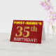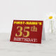 Ce design de carte de voeux d’anniversaire comporte un message comme "FIRST-NAME’S 35th BIRTHDAY!", avec le "35th" ayant une apparence de couleur fausse/imitation or. Le nom du destinataire sur le devant peut être personnalisé, et l’arrière - plan avant est de couleur rouge. Il comporte également un message d'anniversaire personnalisé à l'intérieur. Une carte de voeux comme celle-ci pourrait peut-être être remise à quelqu'un pour célébrer son trente-cinquième anniversaire. [~Z0000184]