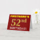 Ce design de carte de voeux d’anniversaire comporte un message comme "FIRSTNAME’S 52nd BIRTHDAY!", avec le "52nd" ayant une apparence de couleur fausse/imitation or. Le nom du destinataire sur le devant peut être personnalisé, et l’arrière - plan avant est de couleur rouge. Il comporte également un message de voeux d'anniversaire personnalisable à l'intérieur. Une carte de voeux comme celle-ci pourrait peut-être être remise à quelqu'un pour célébrer son cinquante-deuxième anniversaire. [~Z0000184]