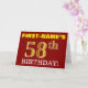 Ce design de carte de voeux d’anniversaire comporte un message comme "FIRST-NAME’S 58th BIRTHDAY!", avec le "58th" ayant une apparence de couleur fausse/imitation or. Le nom du destinataire sur le devant peut être personnalisé, et l’arrière - plan avant est de couleur rouge. Il comporte également un message de voeux d'anniversaire personnalisable à l'intérieur. Une carte de voeux comme celle-ci pourrait peut-être être remise à quelqu'un pour célébrer son cinquante-huitième anniversaire. [~Z0000184]