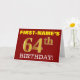 Ce design de carte de voeux d’anniversaire comporte un message comme "FIRST-NAME’S 64th BIRTHDAY!", avec le "64th" ayant une apparence de couleur fausse/imitation or. Le nom du destinataire sur le devant peut être customisé, et l’arrière - plan avant est de couleur rouge. Il comporte également un message d'anniversaire personnalisé à l'intérieur. Une carte de voeux comme celle-ci pourrait peut-être être remise à quelqu'un pour célébrer son soixante-quatrième anniversaire. [~Z0000184]