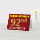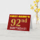 Ce design de carte de voeux d’anniversaire comporte un message comme "FIRST-NAME’S 92nd BIRTHDAY!", avec le "92nd" ayant une apparence de couleur fausse/imitation or. Le nom du destinataire sur le devant peut être customisé, et l’arrière - plan avant est de couleur rouge. Il comporte également un message d'anniversaire personnalisé à l'intérieur. Une carte de voeux comme celle-ci pourrait peut-être être remise à quelqu'un pour célébrer son quatre-vingt-dix-deuxième anniversaire. [~Z0000184]