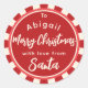 Un autocollant de style postal de Noël pour les cadeaux. Le design a des rayures rouges et crème autour de la frontière et il dit "De Père Noël" à l'avant, avec un arrière - plan rouge festif. L'autocollant est conçu pour ressembler à une marque postale ou à un sceau du pôle Nord. Ce serait parfait pour les cadeaux pour enfants étiquettes, décorer les cadeaux de Noël ou sceller les enveloppes sur une carte de Noël.