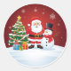 Add a touch of joy to your holidays with this adorable round Christmas sticker! Featuring a cheerful cartoon Santa Claus and a smiling Snowman standing beside a decorated Christmas tree and pile of gifts. The vibrant red background and falling snow create a classic festive atmosphere. Perfect for sealing envelopes, decorating gift wrapping, or adding holiday cheer to your planner and laptop.