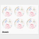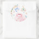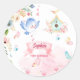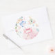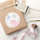 Beautiful round sticker birthday party garden of butterflies, birds and watercolor flowers