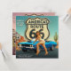 Un design audacieux et rétro inspiré de la Route 66, avec son panneau routier emblématique, une décapotable bleue classique et une pose glamour de pin-up sur fond de désert du Sud-Ouest - parfait pour les amateurs de road-trip, les fans d'Americana et la décoration de garage rétro