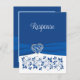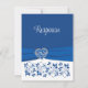 Cette romantique carte RSVP de mariage bleu et blanc avec choix de repas a l'image d'un coeur en argent et bleu royal en fibre sur une image de ruban bleu royal courant à travers la partie inférieure de la carte de réponse avec des fleurs bleues sur un arrière - plan blanc sous le ruban et le mot "Réponse" en gros script blanc sur un arrière - plan bleu au-dessus du ruban. L'arrière a un arrière - plan bleu et blanc royal avec vos détails RSVP et vos sélections de repas imprimés dans deux tons de bleu royal avec un coeur bleu royal en haut et un cadre de défilement entourant le libellé. Si vous avez besoin d'autres articles correspondants, envoyez votre demande par courriel à niteowlstudio@gmail.com ou utilisez la fonction conversation Zazzle pour entrer en contact.