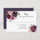 RSVP de mariage bohème rustique avec des fleurs aquarelles luxuriantes en pourpre, violet, rose, mauve et rouge avec une verdure assortie. Le dos de la carte est un pourpre foncé. Le modèle est facile à personnaliser en utilisant un mélange de polices de calligraphie amusantes et manuscrites. L'invitation de mariage assortie est disponible.