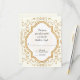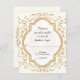 Réponse RSVP à renvoyer par carte postale, y compris une enveloppe blanche. REMARQUE : il s'agit d'une invitation imprimée à plat, il n'y a pas de véritable paillettes ou de feuille métallique utilisée. Les effets sont produits graphiquement. COLLECTION DE DESIGN : Commençant par des fioritures de calligraphie en spirale script dessinées à la main qui ont été transformées en un effet de paillettes graphiques et associées à un double cadre de style quatre-feuilles en bordure également dans des effets de paillettes dorées brillantes. À l'intérieur du cadre et derrière votre modèle de texte facilement personnalisable se trouve un motif de lignes dessinées en forme de soleil. Au verso, il y a un espace pour mettre votre monogramme initial à l'intérieur du motif de soleil en paillettes. Cette invitation est le mariage parfait d'un design sentimental doux et romantique et d'une élégance moderne. Facile à personnaliser pour n'importe