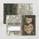 Cartes de réponse de mariage champêtre comportant un arbre rustique avec un cœur sculpté contenant vos initiales et une citation d'amour douce, des guirlandes de lumières scintillantes et une formulation moderne de RSVP de mariage sur un décor forestier délavé.