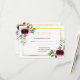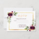 Une carte RSVP élégante pour un mariage avec des modèles pour répondre par date, noms, etc. Un cadre en faux or avec des fleurs roses bohème de style bohème de couleur aquarelle en bordeaux. Lettres arrière - plans blanches, bordeaux et dorées. Retour : Nom de la mariée et du marié, et date du mariage.