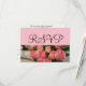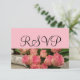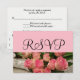 Mariage RSVP écrit dans un élégant script noir contre arrière - plan rose pastel, Roses rose pâle et joli bouquet verdoyant. Personnalisez l'envers en typographie noire contre un arrière - plan blanc immaculé. Photographie et design originaux de TamiraZDesigns.