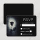 Une carte de réponse de mariage sombre et mystérieuse avec une illustration cool d'une rose noire de style gothique / emo avec du sang rouge qui coule sur ses pétales. Un fond grunge noir avec une couleur blanc cassé au centre mettant en valeur cette rose sombre et macabre.