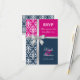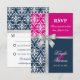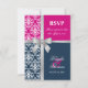 © Socialite Designs. Carte de réponse élégante pour invitation de mariage d'été incorporant un damas blanc, un ruban argenté imprimé en forme de croix et de nœud, et deux couleurs de fond, bleu marine et fuchsia. Veuillez contacter Socialite Designs si vous souhaitez une combinaison de couleurs différente, de l'aide pour la personnalisation, ou d'autres produits de mariage créés avec ce design. VEUILLEZ NOTER QUE LE RUBAN EST UNE IMAGE ET EST IMPRIMÉ SUR L'INVITATION.