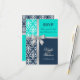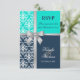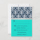 © 2013 Socialite Designs. Carte de réponse élégante pour invitation de mariage d'été ou d'hiver incorporant un damas blanc, un ruban argenté imprimé en forme de croix et de nœud, et deux couleurs de fond, bleu marine et turquoise / aqua. Veuillez contacter Socialite Designs si vous souhaitez une combinaison de couleurs différente, de l'aide pour la personnalisation ou d'autres produits de mariage créés avec ce design. VEUILLEZ NOTER QUE LE RUBAN EST UNE IMAGE ET EST IMPRIMÉ SUR L'INVITATION.