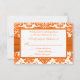 Cette carte de réponse damassée orange et blanche moderne et tendance est dotée d'un ruban orange vif imprimé et d'une broche diamant et bijoux imprimée qui correspond à l'invitation de mariage présentée ci-dessous. Si vous avez besoin d'articles assortis dans ce design, veuillez envoyer votre demande par courriel à niteowlstudio@gmail.com.