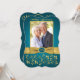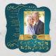 Cette élégante invitation photo pour le 50e anniversaire de mariage, de couleur sarcelle bleu-vert et ornée de fleurs et de volutes dorées, comporte un ruban doré IMPRIMÉ et un médaillon sarcelle et or à l'aspect de faux gravé. Elle dispose d'une zone de modèle où vous pouvez télécharger votre propre photo numérique. Vous pouvez supprimer le texte "Anniversaire de mariage" ou "50e" en écriture cursive stylisée. Tout le texte est personnalisable, ainsi que les choix de papier. ****VEUILLEZ NOTER que si vous choisissez du papier métallisé doré, il s'agit d'un or très foncé et cuivré qui modifiera les couleurs du design (donnera une teinte dorée à la photo, etc.), aussi je vous déconseille fortement d'utiliser ce papier. Le papier feutré modifiera également légèrement la couleur de votre photo. DE PLUS, si vous changez de police ou de taille de police, votre texte risque de ne plus être correctement disposé. Zazzle ne corrigera rien pour les fautes de frappe, l'alignement ou autre, et je ne verrai pas votre invitation. Tout sera imprimé tel qu'il apparaît sur votre écran. Si vous avez besoin d'aide pour l'invitation, veuillez me contacter AVANT de la commander. Cette invitation est conçue pour s'adapter à la carte de forme incurvée de taille 5x7. Si vous cho