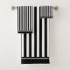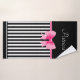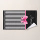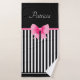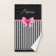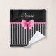 Nom serviette de bain personnalisée avec un motif classique noir et blanc rayures, arc rose et ruban. Pour la personnaliser, tapez votre nom dans le champ modèle. La salle de bains offre un ensemble douche/baignoire avec pomme de douche amovible.