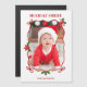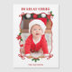Cadre ruban rouge, joli, audacieux et festif, décoré d'arcs et de fleurs de Noël avec un seul modèle photo portrait, "Holiday Cheer" texte graphique en police décorative personnalisée et champs de texte modifiables. L'arrière comporte un modèle photo de carré de ruban rouge supplémentaire et des champs de texte.