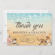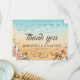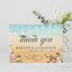 Mariage de plage tropicale cartes de remerciement mettant en vedette un arrière - plan rustique ombre jaune à bleu aquarelle, étoiles de mer, coquillages, lumières à cordes, deux coeurs dans le sable avec vos initiales, et un élégant modèle d'appréciation de mariage qui est facile à personnaliser.