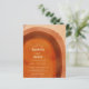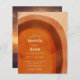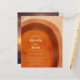 Faire-part de mariage budget de style Boho avec une arche abstraite peinte dans des couleurs terreuses du désert d'orange brûlé, de terre cuite, de rouille et de brun. Les détails de votre mariage sont dans une mise en page moderne avec vos noms dans une police de style rétro pour une tournure amusante. Le dos a votre photo préférée.