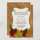 Faire-part de mariage à thème Rustic Fall, avec un arrière - plan de grains de bois rugueux et des graphiques de feuilles d'automne colorées au bas de la zone de texte ivoire. Le texte en noir est prêt à être personnalisé pour votre grand jour. Des produits de coordination sont disponibles.