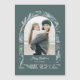 This unique design features a trendy arch-shaped photo template with a white line drawn winter botanical border on a sage green background.