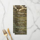 Menu du dîner mariage en bois rustique et chapelet de lumières. Le menu fait partie d'un ensemble de faire-part de mariage
