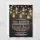 Rustic Mason Jar Rehearsal Dinner Invitations - dispose d'un arrière - plan en bois imprimé avec des lampes à cordes et des bocaux de mason éclairés.