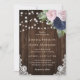 Complétez votre mariage bleu marine et rustique avec ces invitations florales chic avec des fleurs bleues et rousses et du bois de grange orné de dentelle fleurie blanche et de lampes à cordes. Éléments correspondants disponibles.