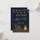 Set against a deep midnight blue background, this card glows softly with string lights and candlelit warmth, perfectly accented by lilac and sage botanical details. The elegant calligraphy and wooden textures add a cozy rustic touch, blending nature and night into one timeless keepsake.