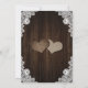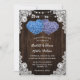 Rustic purple and blue floral wedding invitation featuring two floral hearts on a barn wood background adorned with white floral lace and string lights. Perfect card design for inviting your guests to your purple and blue rustic wedding party.