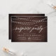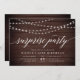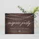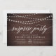 Nos invitations festives surprises comprennent un arrière - plan rustique en planches de bois avec des cordes de lumières blanches brillantes sur le dessus, et "fête surprise" dans la typographie de script de calligraphie chic. Personnalisez avec vos détails de fête surprise sous blanc; peut être utilisé pour n'importe quelle occasion, comme les fêtes d'anniversaire ou les fêtes d'anniversaire.