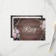 Rustic wedding RSVP card featuring a rich wood background, soft floral accents, and delicate string lights framed by modern geometric lines. Elegant script typography adds a romantic touch, blending rustic charm with contemporary style. Perfect for barn weddings, outdoor celebrations, or nature-inspired wedding stationery suites.