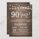 Rustic Surprise 90th Birthday Invitation Arrière - plan de bois avec des lumières à cordes. 13ème 15ème 16ème 18ème 20ème 21ème 30ème 40ème 50ème 60ème 70ème 80ème 90ème 100ème, Tout âge. Anniversaire adulte. Fête d'anniversaire d'une femme ou d'un homme. Pour plus de personnalisation, cliquez sur le bouton "Customiser" et utilisez notre outil de conception pour modifier ce modèle.