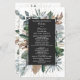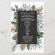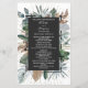 Feuilles de palmiers et autres motifs botaniques autour d'un rectangle gris foncé avec du texte blanc.