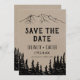 Cette montagne boisée rustique, sauf la carte datant, est parfaite pour un mariage boisé. Le design d'inspiration nature présente la silhouette d'une forêt de pins et de montagnes sur papier imitation kraft. Veuillez noter que ceci n'est pas imprimé sur du papier kraft réel. C'est un graphisme de haute qualité fait pour ressembler à du papier kraft.