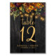 Numéro de table de mariage rustique et élégant avec texte modifiable avec botaniques d'automne et un script chic sur un arrière - plan en bois de grange brun foncé avec lumières à cordes. Idéal pour votre été ou automne jardin jardin d'automne en plein air ou mariage de ferme.
