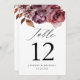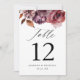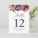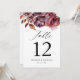 Elégantes cartes de numéro de table mariages à fleurs automnales avec une bordure supérieure de fleurs d'aquarelle et de feuillage dans les tons marsala, bordeaux, violet, brun et orange, complétées par un script de calligraphie moderne. Pour commander les cartes de table : ajoutez votre nom, votre date de mariage et votre numéro de table. Ajoutez chaque numéro à votre panier individuellement et retirez-le lorsque vous avez terminé. Conçu pour coordonner avec notre collection Rustique de mariages floraux d'automne.